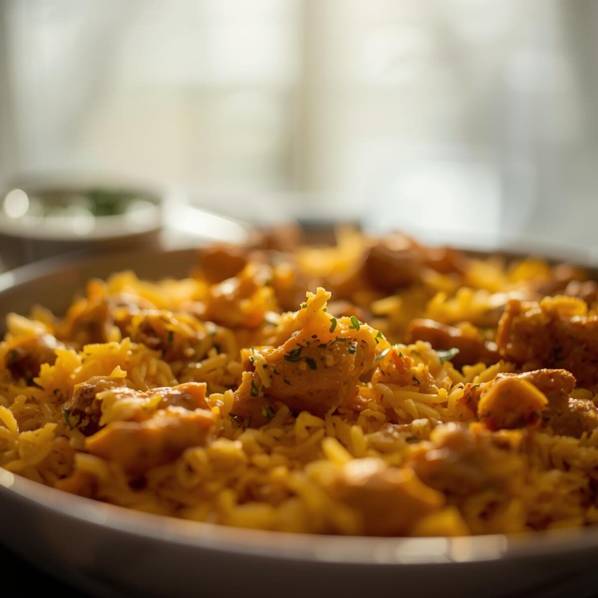 Innovative biryani featuring butter chicken flavoured rice with tender chicken pieces, combining two favourites into one dish. Served with raita.