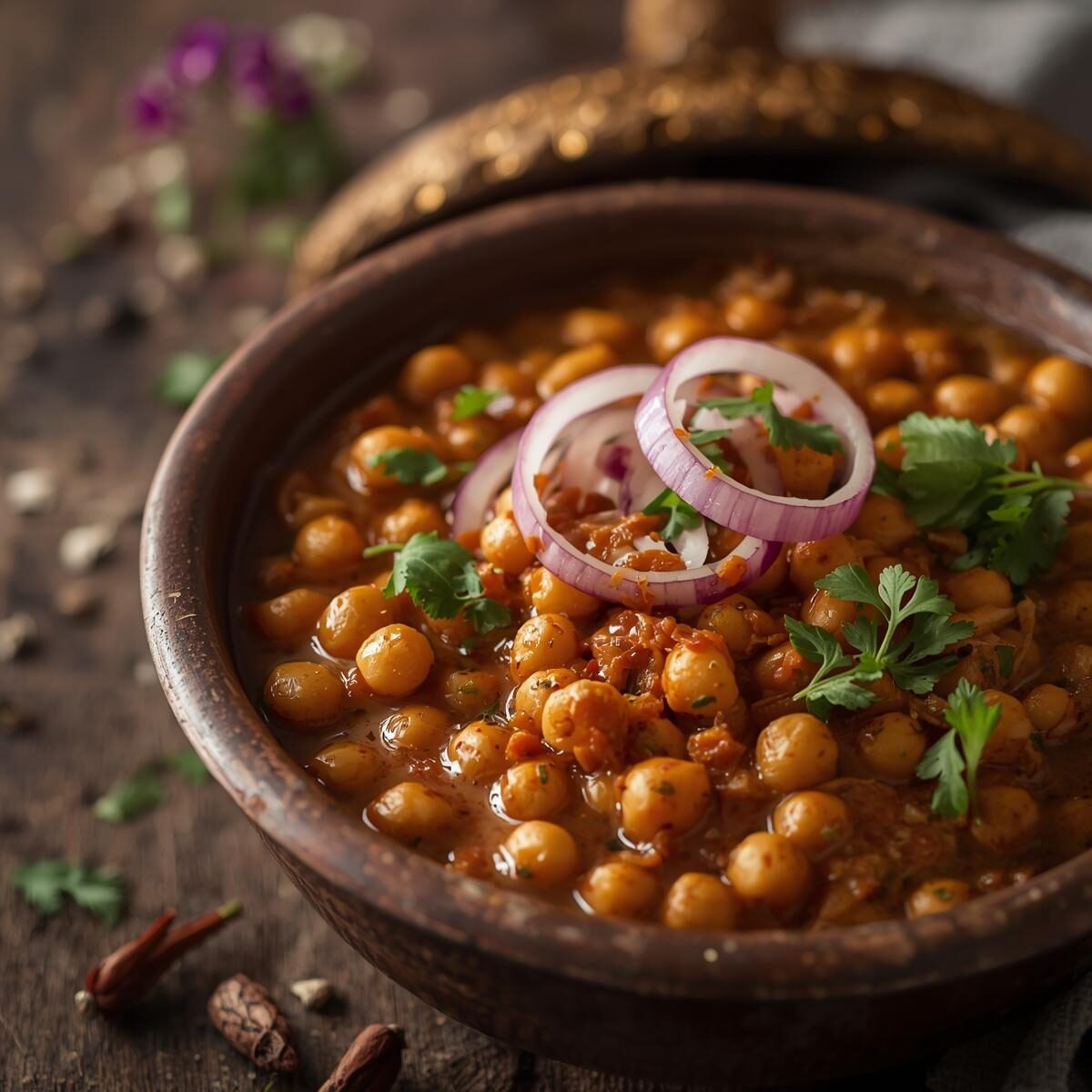 Classic North Indian curry with tender chickpeas simmered in a tangy, spiced tomato-onion gravy with dried mango powder and aromatic spices. Protein-packed and full of flavor.