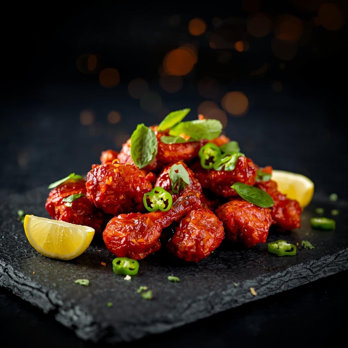 South Indian favorite featuring crispy fried chicken pieces marinated in a fiery blend of spices, curry leaves, and red chillis. Addictively crunchy with bold flavors.