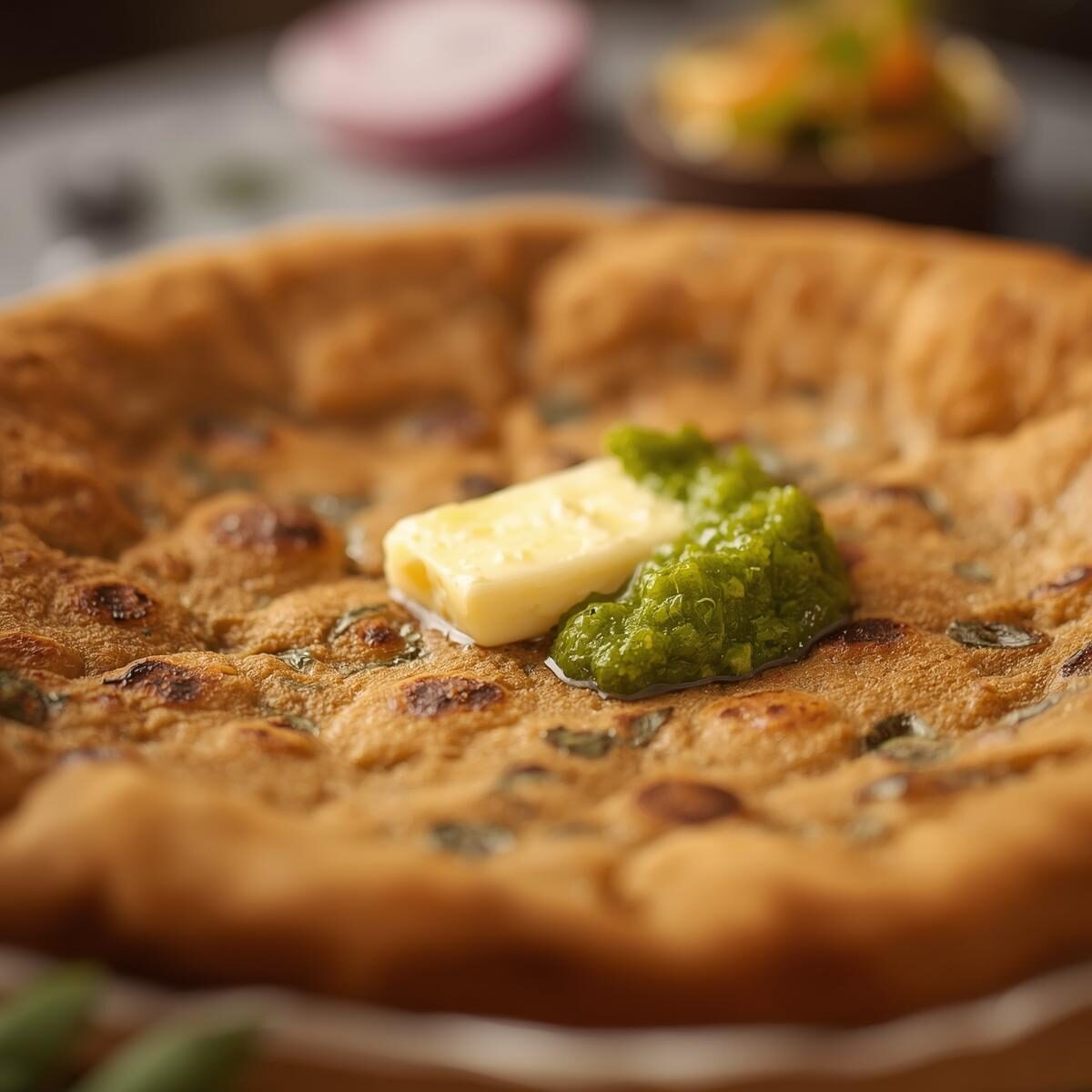 Flaky whole wheat paratha generously stuffed with spiced, grated cauliflower – golden-crisp on the outside, soft and flavorful inside. Served with cooling raita or zesty green chutney.