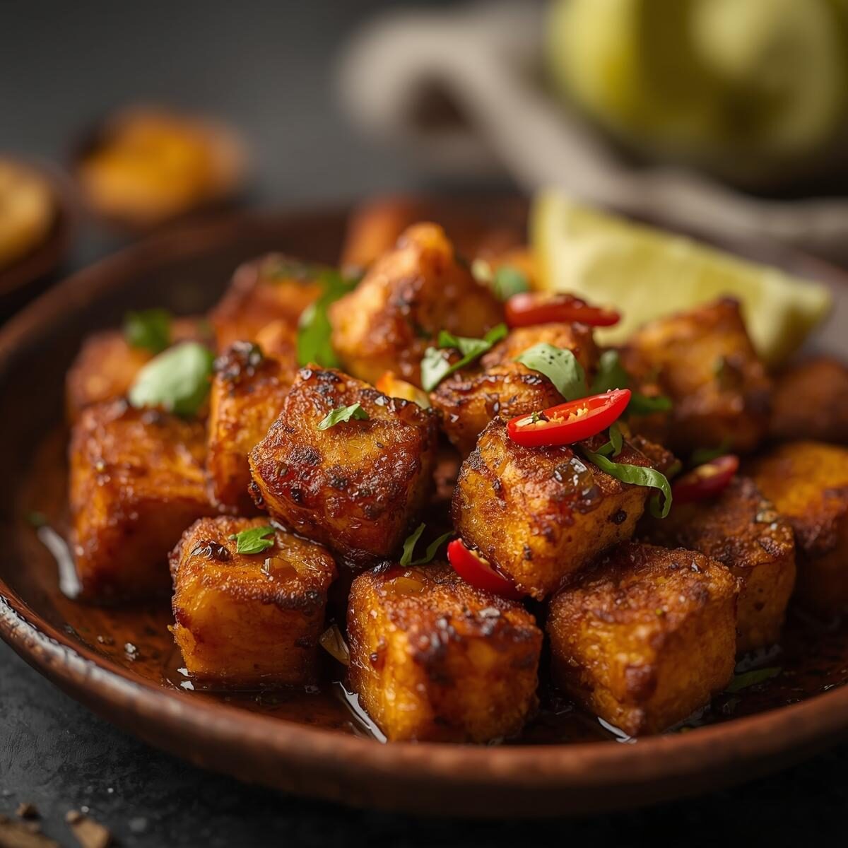 South Indian inspired crispy fried paneer cubes marinated in bold spices, curry leaves, and red chillis. Vegetarian twist on the classic Chicken 65.