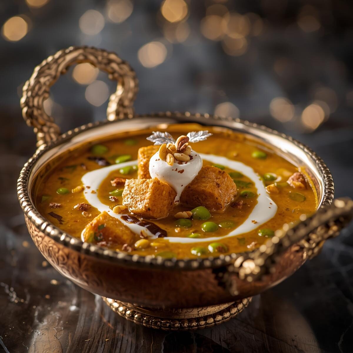 Elevated version of classic matar paneer – soft paneer cubes and sweet green peas in a luxurious cashew and cream based gravy with royal Mughlai spices. Fit for royalty.